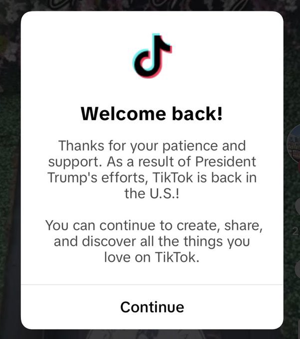 Ancak bu yasak uzun sürmedi. Trump yönetiminin doğrudan müdahalesiyle, erişim engeli yalnızca 14 saat sonra kaldırıldı ve TikTok yeniden hizmet vermeye başladı. Bu gelişme, TikTok’un ABD’deki varlığı konusunda geçici bir rahatlama sağladı. TikTok erişim engeli kaldırıldığında ABD kullanıcılarına iletilen bildiriyi aşağıdaki görselde bulabilirsiniz: