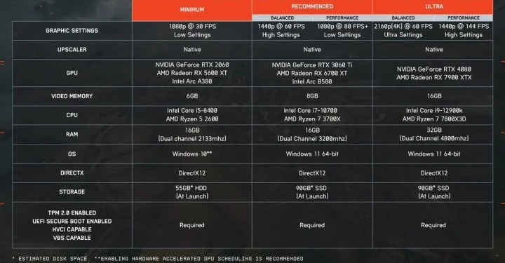 Önerilen Sistem Gereksinimleri (1440p – 60 FPS yüksek / 1080p – 80+ FPS düşük ayarlar)