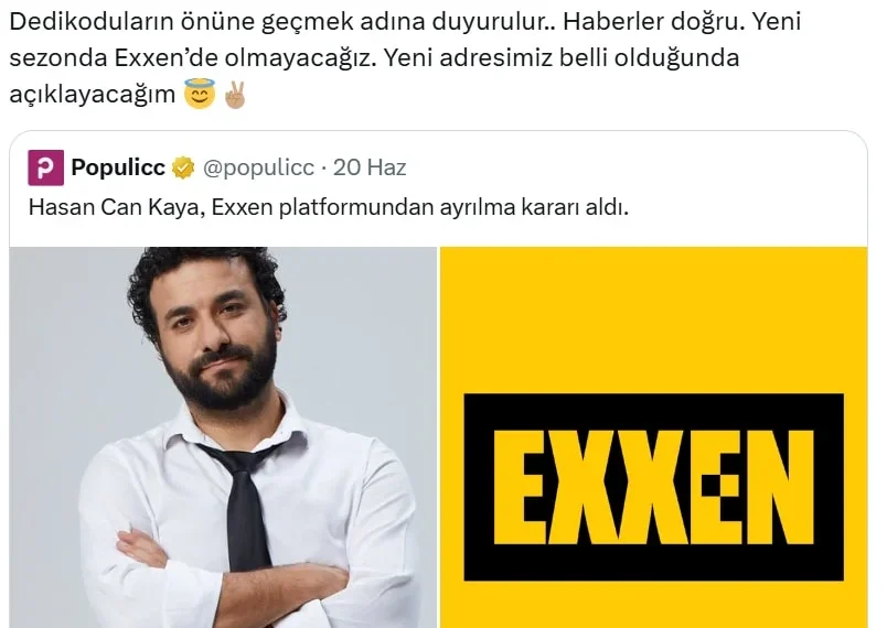 Bir süredir kulislerde konuşulan ayrılık iddialarına noktayı koyan Hasan Can Kaya, sosyal medya hesabı üzerinden yaptığı açıklamada “Hakkımızda çıkan dedikodulara açıklık getirmek istedim. Evet, yeni sezonda Exxen’de yer almayacağız. Yeni yayın adresimiz netleşince duyuracağım” diyerek takipçilerini bilgilendirdi.