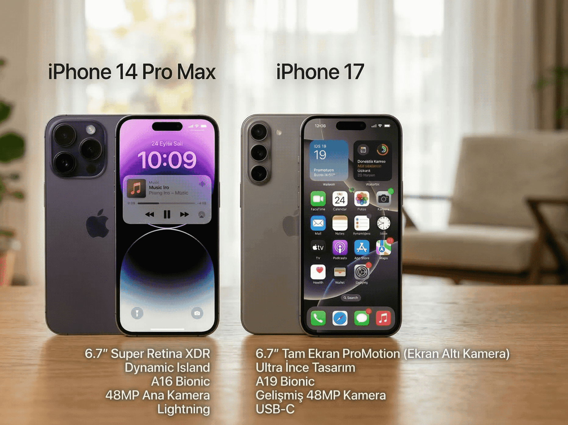 Donanım özelliklerinin ötesinde, tasarım ve bağlantı noktalarında da anlamlı değişiklikler bulunuyor. iPhone 14 Pro Max, klasik Apple tasarımıyla ve Lightning girişli yapısıyla dikkat çekiyordu. Ancak iPhone 17 ile birlikte, Apple, bu alanlarda büyük bir değişiklik yapıyor ve USB Type-C girişine geçiş gerçekleştiriyor. Bu değişiklik, sadece kablosuz şarj ve veri aktarımı açısından değil; aynı zamanda aksesuar uyumluluğu ve daha hızlı şarj imkanlarıyla da büyük kolaylık sağlıyor.