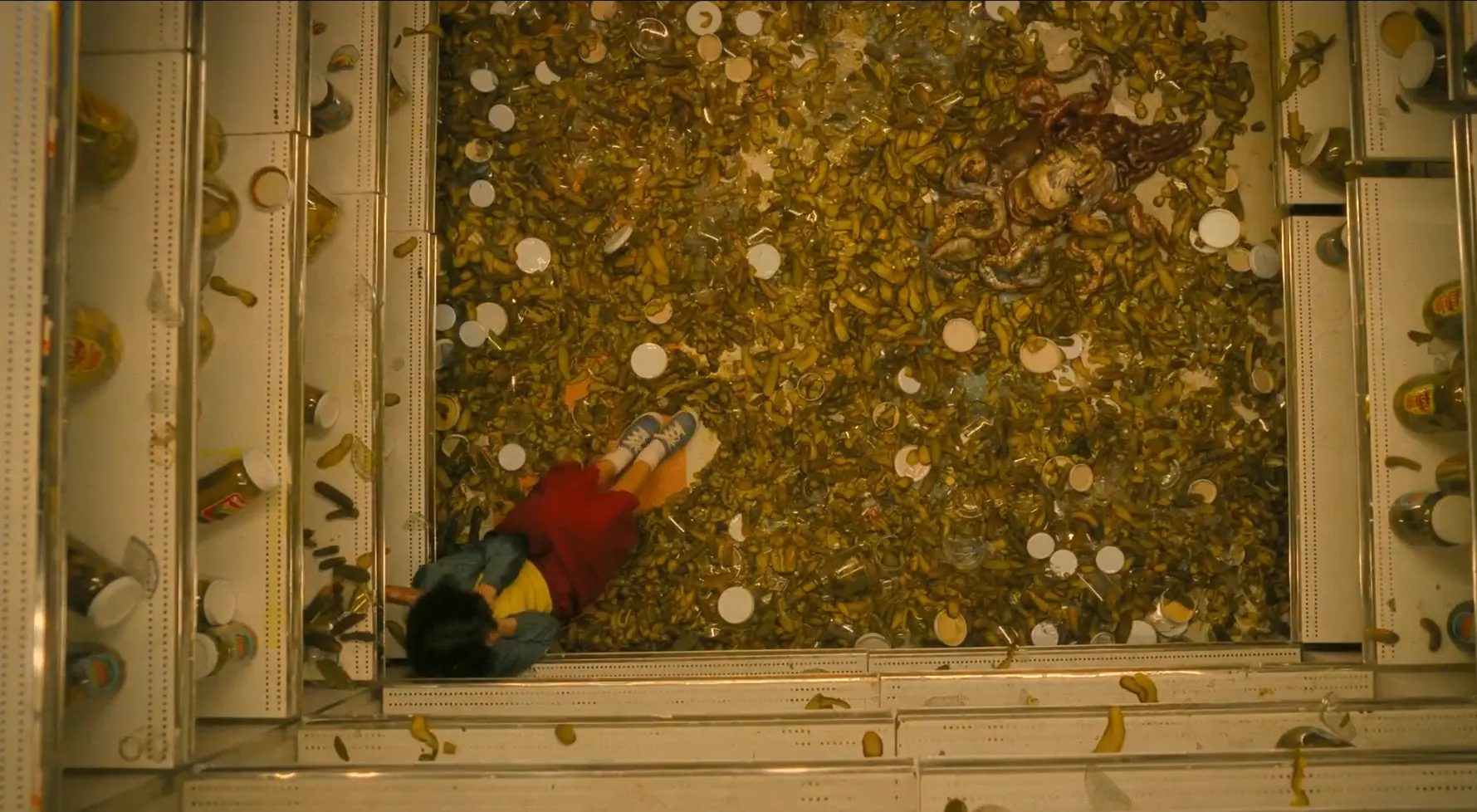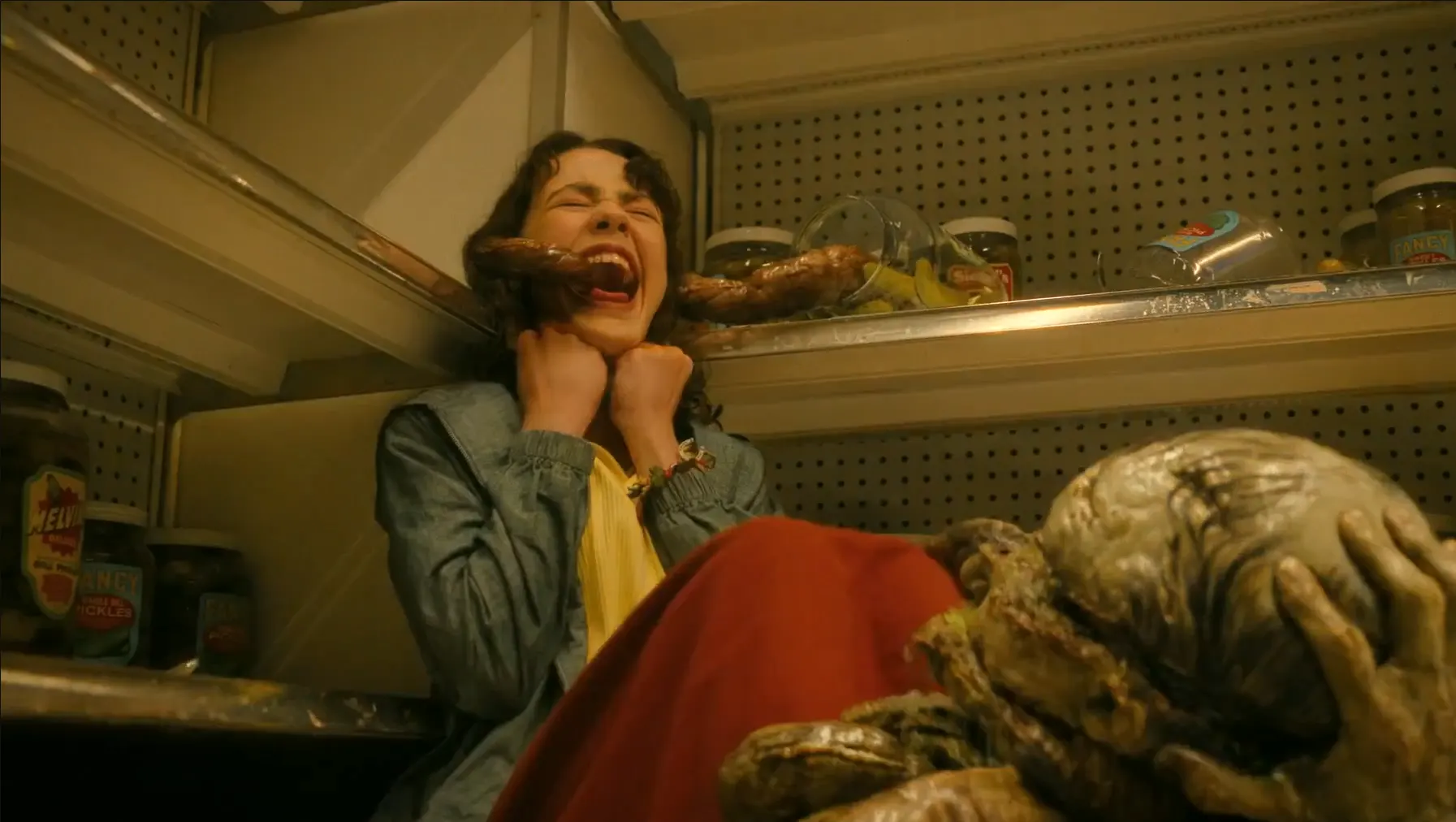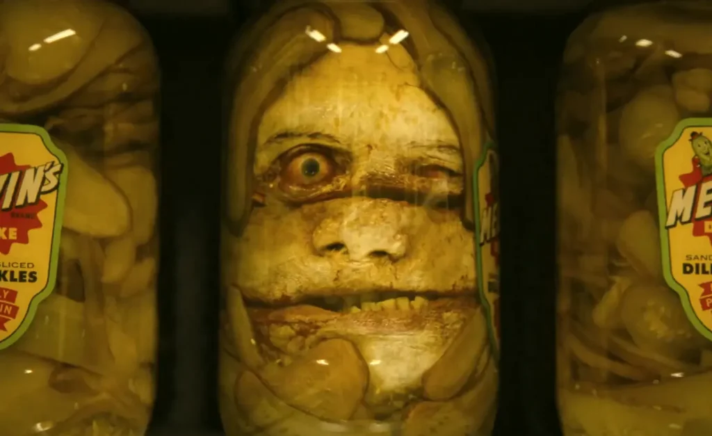 Lilly‘nin babasının bir salamura fabrikası kazasında parçalanarak ölmesiyle ilgili travması, bir süpermarket sahnesinde canlanıyor. Pennywise, Lilly‘nin etrafındaki normal insanları tuhaf, tehditkar figürlere dönüştürerek paranoyasını körüklüyor. Raflar hareket ediyor, kayıp çocukların resimleri çürümüş kutularda beliriyor ve en nihayetinde, salamura kavanozları açılıp babasının parçalanmış cesedini yansıtıyor. Bu sahne, Lilly‘nin sınırda hissettiği akıl sağlığı korkusunu ve gerçekliğin ne olduğu konusundaki belirsizliğini derinleştiriyor. Polis Şefi Bowers‘ın Lilly‘yi akıl hastanesine geri gönderme tehdidi, bu korkuyu daha da gerçekçi bir hale getiriyor.