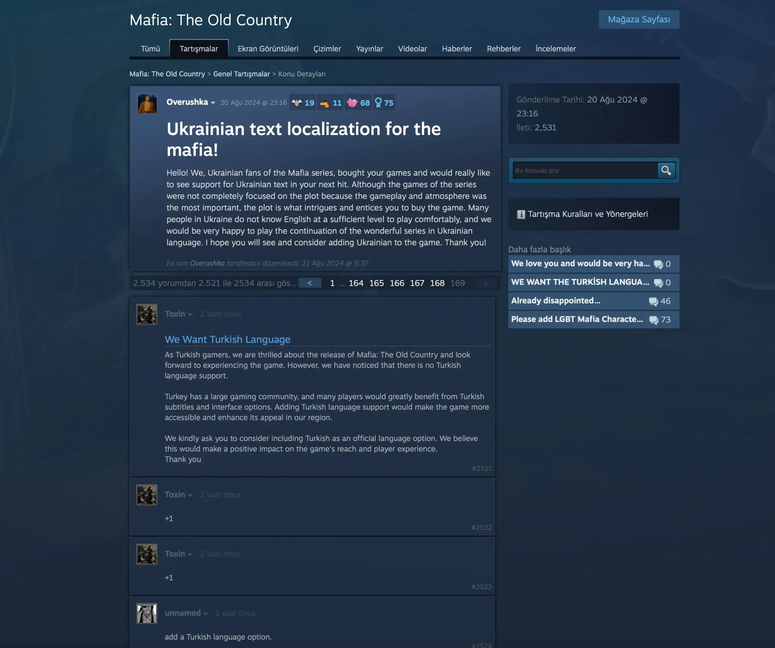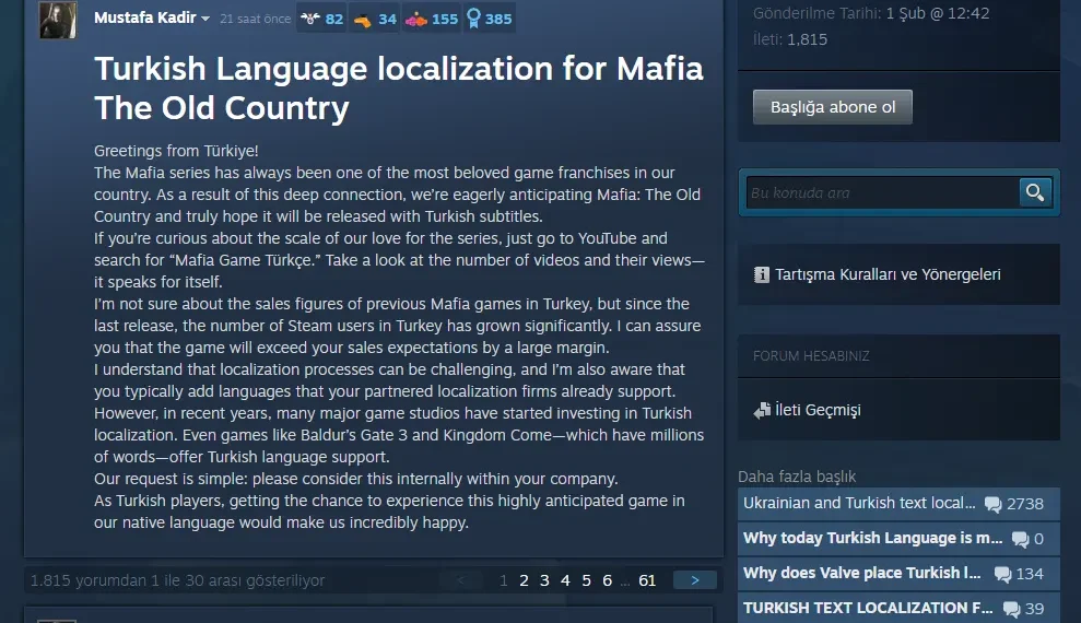 Türk oyuncuların Mafia: The Old Country için başlattığı Türkçe dil desteği kampanyası, Steam forumlarında büyük yankı uyandırmaya devam ediyor. Kampanya kapsamında açılan başlıklar, kısa sürede 1.000’den fazla yoruma ulaşarak dikkat çekti. Ancak bu süreçte, Steam moderatörleri tarafından bazı başlıklar kaldırıldı ve Türk oyuncuların talepleri, daha önce Ukraynalı oyuncuların açtığı başlık altına taşındı.