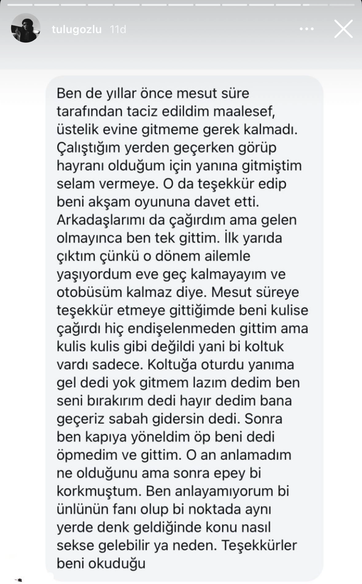 Kadın, üniversite yıllarında bir dergi projesi için Süre ile tanıştığını ve staj görüşmesi için Beşiktaş’ta bir çay bahçesinde buluştuğunu aktardı. Süre’nin “Evde yemek yiyelim” teklifini kabul ettiğini, ancak evde yemeğin ardından Süre’nin kendisini zorla koltuğa yatırıp öpmeye çalıştığını öne sürdü. 1,60 boyundaki kadına göre, 2 metreyi aşan Süre’ye karşı mücadele ederek kaçtığını belirtti. “13 yıl önceydi, mesaj kalmamış, sadece ıspanak yemeği hatırlıyorum” diyerek kanıt sunamadığını, ama sessiz kalmak istemediğini ifade etti. X’ platformunda yapılan paylaşımlar, bu cesaretin elbette hepimizi düşündürmesi gerektiği yönünde.