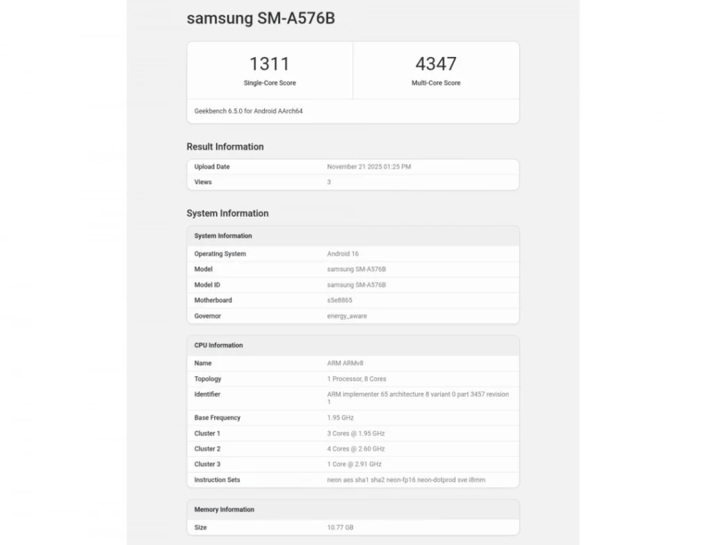 Samsung Galaxy A57 Geekbench 6.5 Skorları: Tek Çekirdek 1311 – Çok Çekirdek 4347 Puanla A55’i Ezdi Geçti!