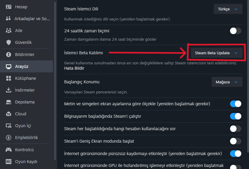 - “Steam Beta’ya Katıl” seçeneğini etkinleştirin; istemci yeniden başlayacak.