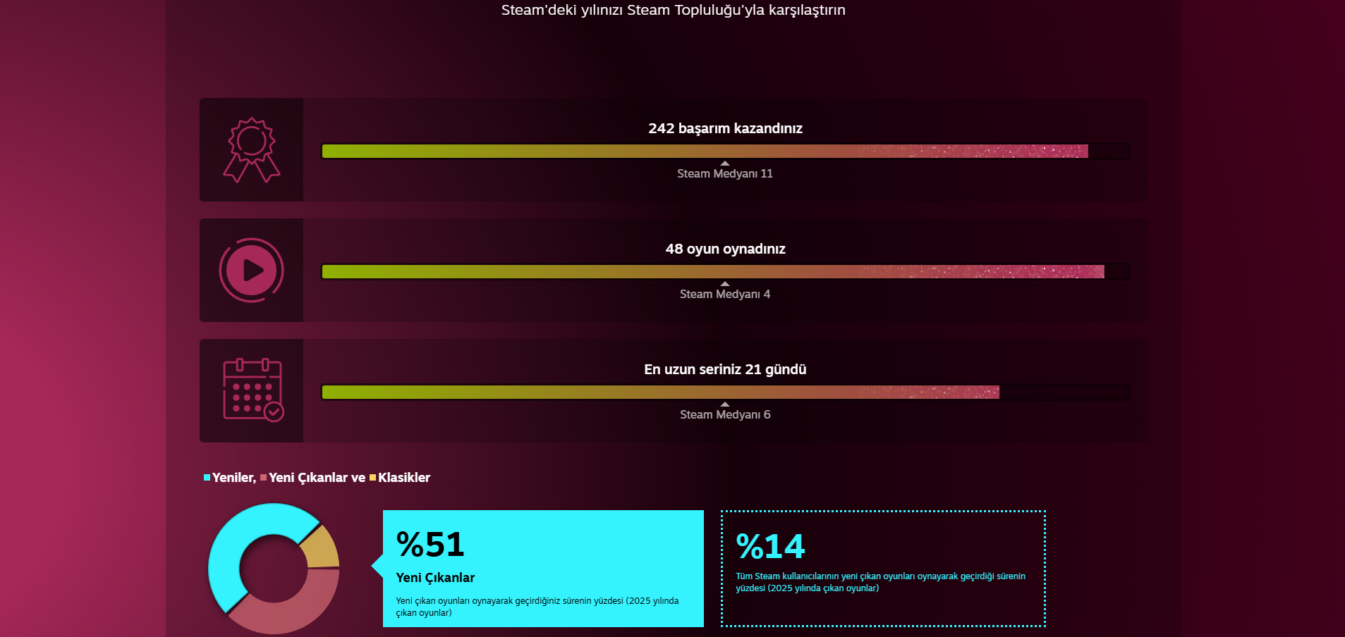 Steam Retrospektifi 2025 kendine has yapısıyla, yıl sonunda yapılan bir tür rapor gibi düşünülüyor. Bu rapor sayesinde, yıl boyunca hangi oyunlara daha çok zaman harcadığınızı, toplam oturum sayınızı ve yine yıl boyunca topladığınız başarımları görebiliyorsunuz. Örneğin, örnek verilecek olursa, en çok sevdiğiniz oyunu kaç saat oynadınız? En az oynadığınız dönem hangisiydi? Bütün bunlar, bu yılki oyun alışkanlıklarınızı daha iyi analiz edebilmeniz için yeni ve benzersiz bilgiler sunuyor. Ayrıca, yıl boyunca yeni keşfettiğiniz oyunlar ve onlara ayırdığınız toplam vakit de bu raporda yer alıyor.