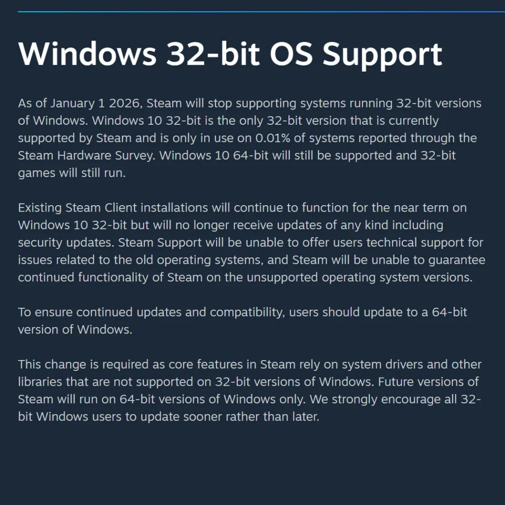 Şirketin resmi duyurusuna göre, 19 Aralık 2025 itibarıyla Steam‘in bütün istisnasız sürümleri sadece 64-bit Windows 10 ve Windows 11 işletim sistemleriyle uyumlu hale getirildi. Bu tarihten sonra, 32-bit Windows sürümleri için teknik altyapı ve güncelleme akışı tamamen durdurulacak. Kullanıcılar, eski sistemlerinde güncellemeleri alamayacak, yeni özellikleri kullanamayacak ve Steam platformunda yaşanabilecek güvenlik açıklarına karşı savunmasız kalacaklar.
