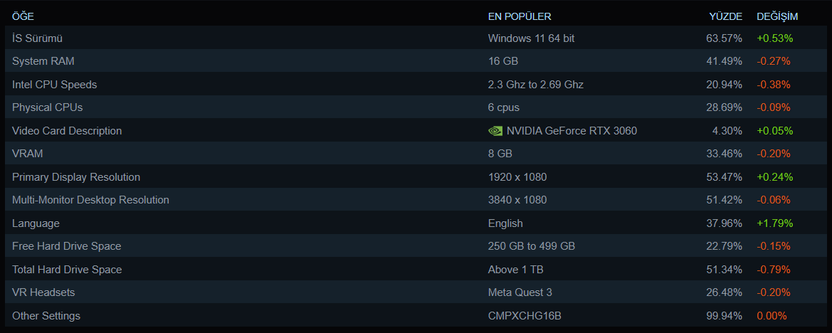 Steam anketi ile yapılan detaylı incelemeler, donanım kullanımında en popüler markaların ve modellerin öne çıkmasıyla birlikte, pazar paylarının sürekli değiştiğine işaret ediyor. Steam‘in yapmış olduğu anketin verileri, yalnızca mevcut trendleri yansıtmakla kalmıyor, aynı zamanda gelecekteki gelişmeler hakkında da tahminde bulunmamızı sağlıyor. Kullanıcılar ve sektör profesyonelleri için bu bilgiler, bilinçli kararlar vermek adına büyük bir öneme sahip. İşte detaylar: