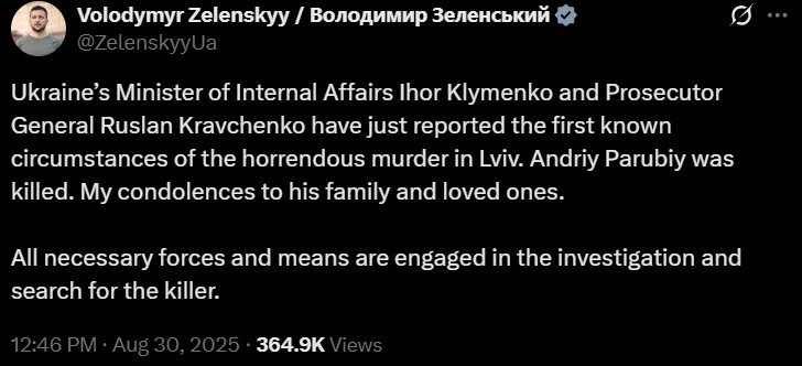 Yerel polis, öğle saatlerinde gelen bir ihbar üzerine Lviv’in Frankivskyi bölgesine intikal etti. Yetkililer, kurbanın olay yerinde vefat ettiğini belirtirken, kimlik tespiti başlangıçta sağlanamadı. Ancak Ukrayna Cumhurbaşkanı Volodimir Zelenskiy, yaptığı açıklamada Andrii Parubii’nin hayatını kaybettiğini doğruladı. Zelenskiy, yaptığı açıklamayla İçişleri Bakanı ve Başsavcının, Lviv’deki bu korkunç cinayetin ilk detaylarını paylaştığını, Andrii Parubii’nin öldürüldüğünü duyurarak; ailesine ve sevenlerine başsağlığı dileklerini iletti. İlgili soruşturma için de tüm kaynakların seferber edildiğini vurguladı.